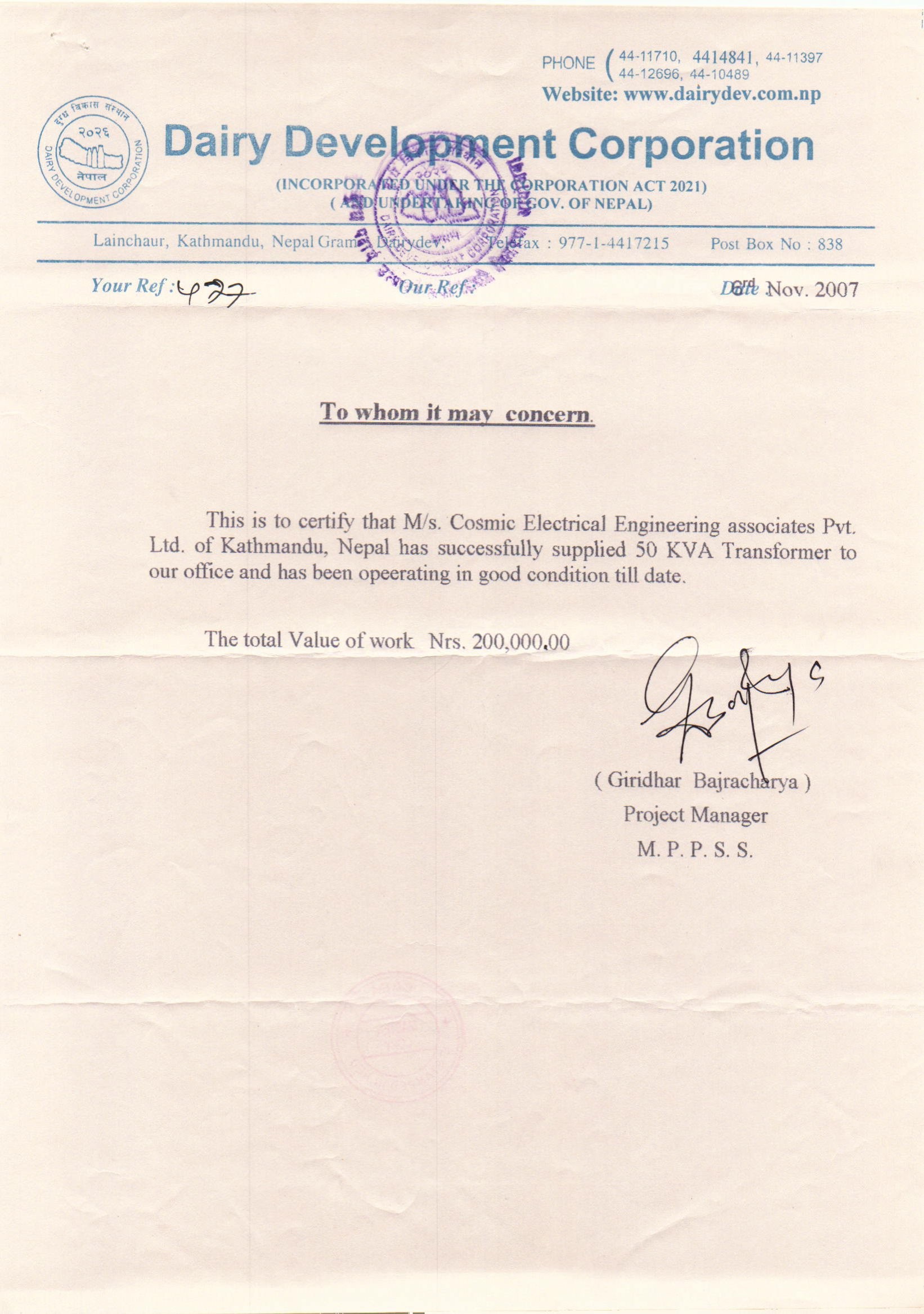 | 18 | Dairy Development corporation project |